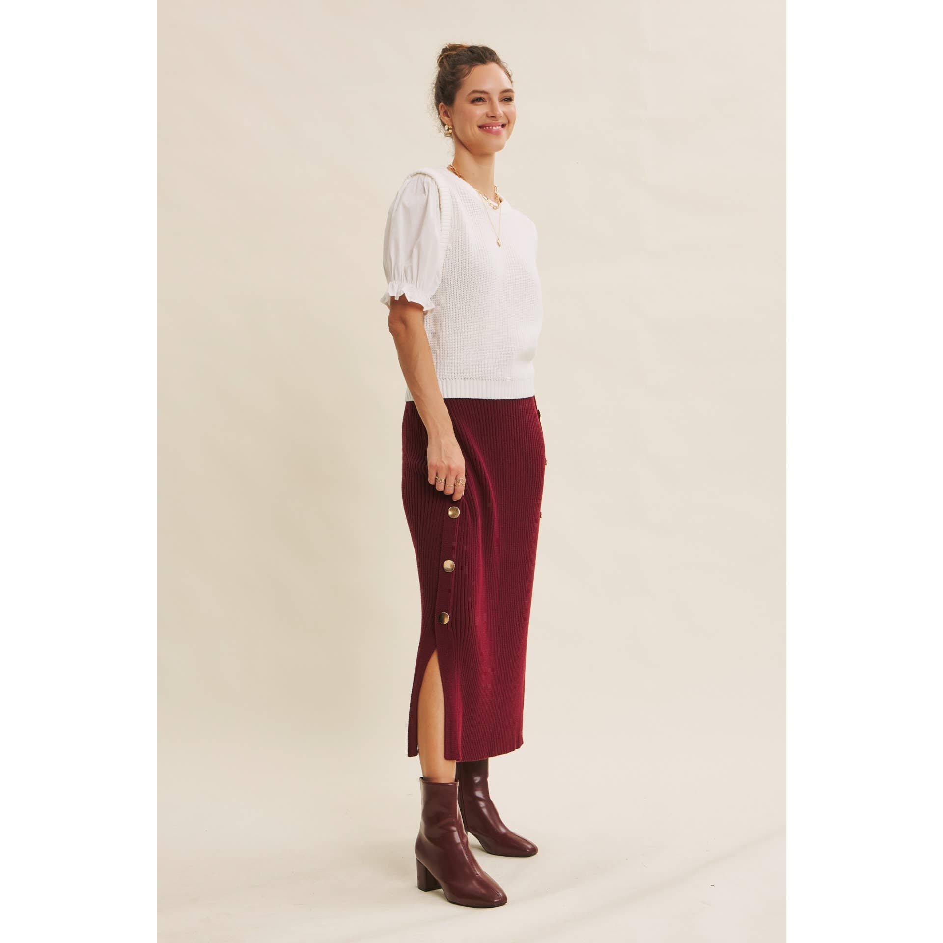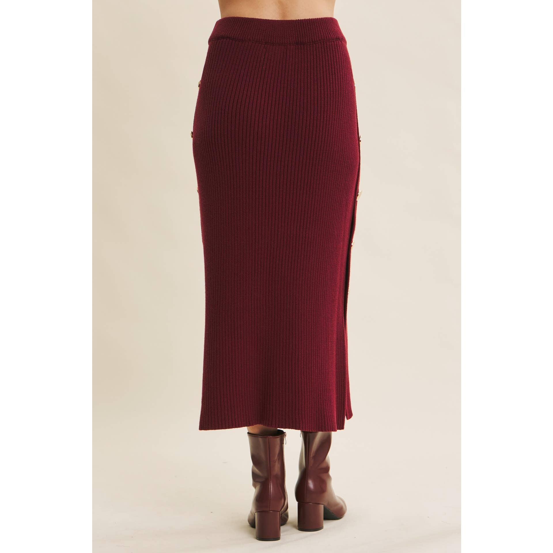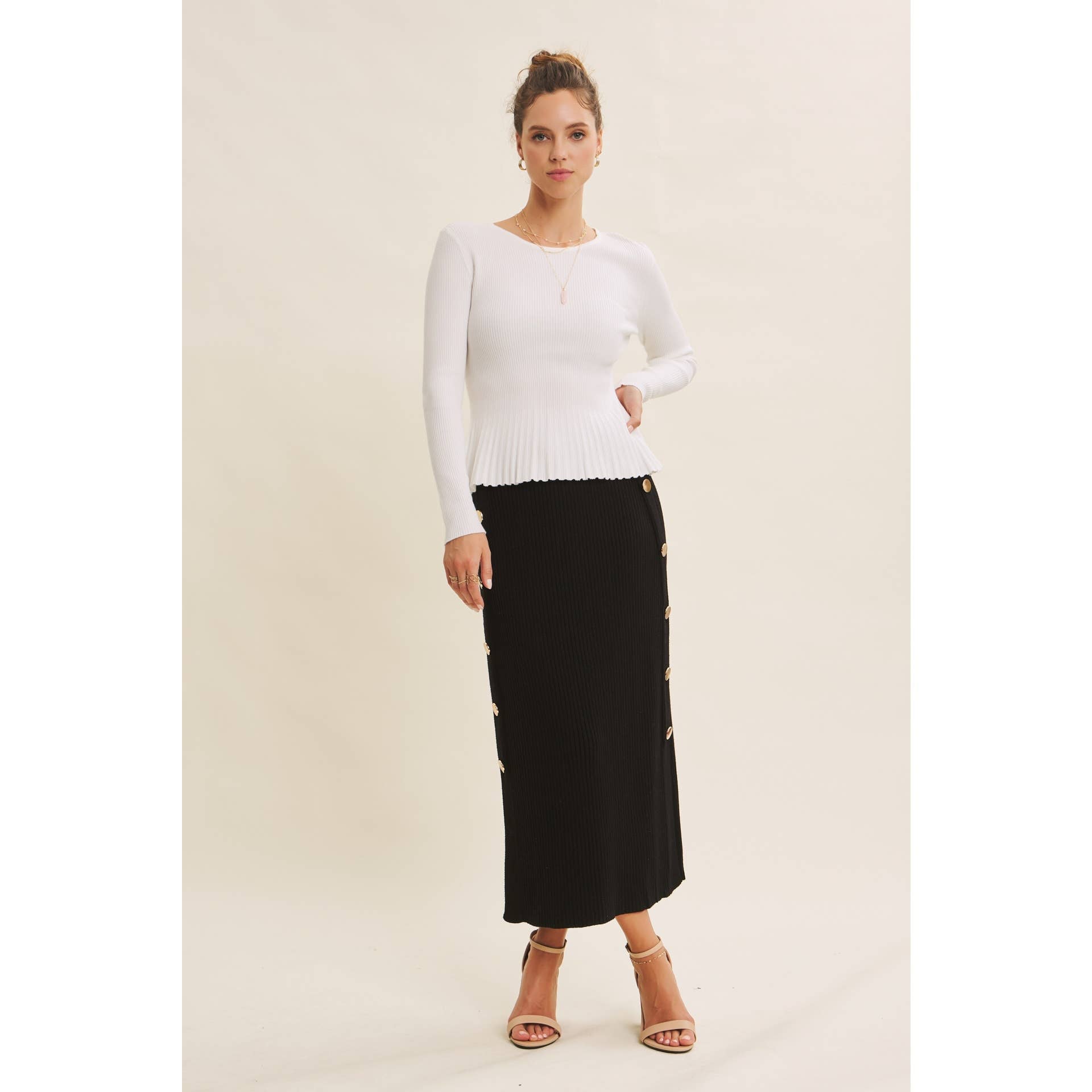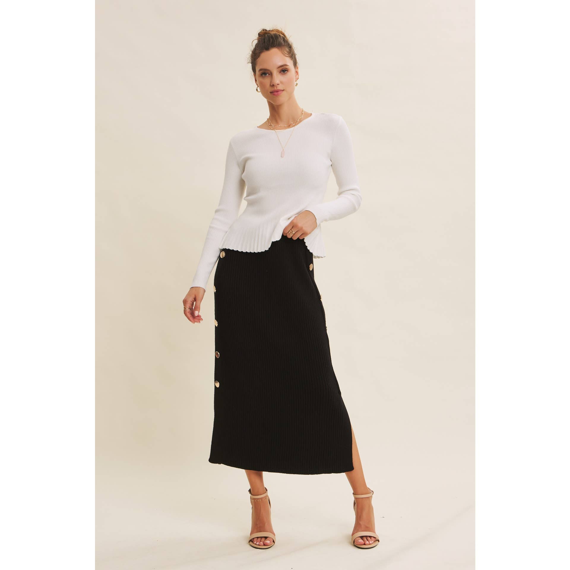 Where classic meets sultry. This ribbed knit maxi skirt is designed to hug you gently while creating a sleek, elongating silhouette. Made from a soft-yet-structured acrylic-cotton blend, it features polished side buttons and a slit that offers just the right amount of movement—and a hint of leg. The stretchy waistband ensures comfort all day, whether styled with a cozy sweater or a crisp blouse. Perfect for dressing up or down, this skirt blends elegance with ease. Wear it from desk to dinner, or style it with boots and a knit vest for an updated fall uniform.