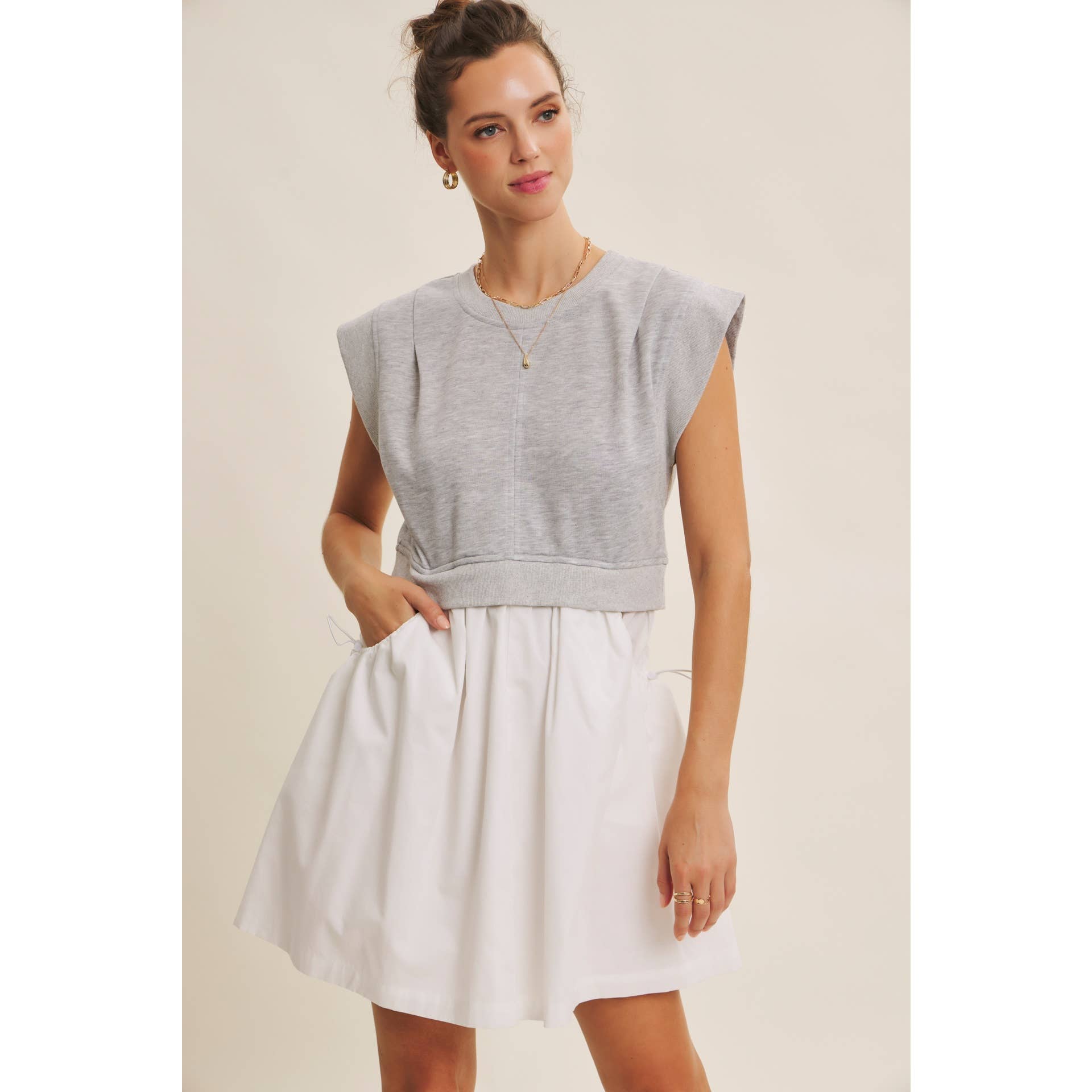 Where casual meets preppy chic. This mixed media mini dress is your go-to for effortless days that still look styled. The structured shoulder detail and cotton skirt give it that “sporty yet polished” feel, while the relaxed sweatshirt bodice adds comfort and cool-girl ease. Featuring a babydoll silhouette, side pockets with adjustable drawcords, and a subtle drop-shoulder cut, it perfectly balances laid-back charm with a clean, modern shape. Whether paired with sneakers for errands or sandals for brunch, it’s that versatile piece you’ll reach for again and again.